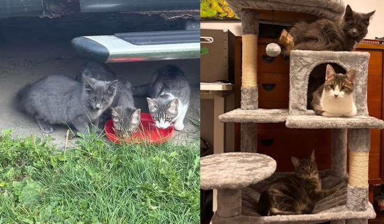 The “royal” kittens, two males and one female, were rescued at four months old from a backyard colony. Their mother used to visit the yard for food, she brought her kittens there when they were around 8 weeks and then disappeared. Once a foster home opened up, the kittens were brought indoors. They were spayed/neutered, vaccinated, dewormed, and treated for fleas.